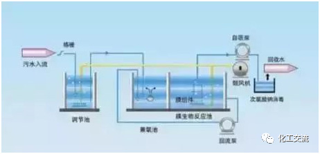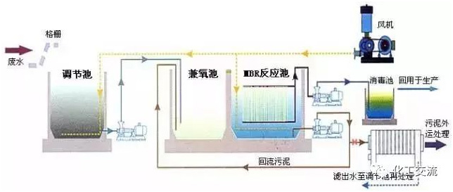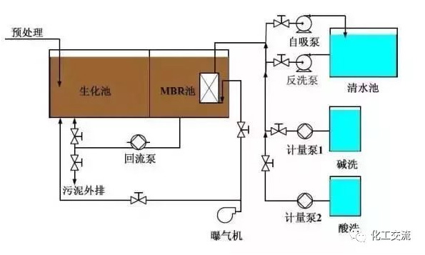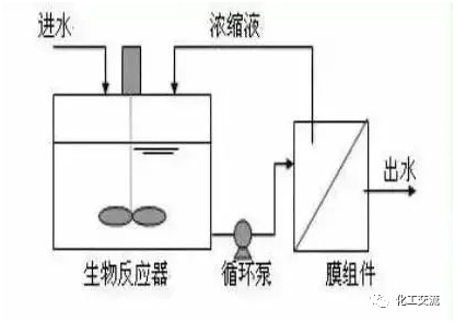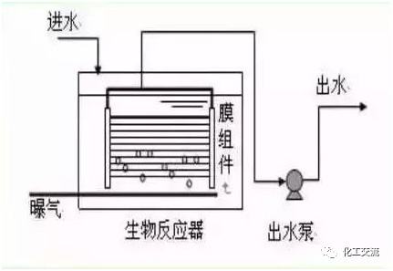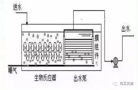 生物反应器中的混合液经循环泵增压后打至膜组件的过滤端,在压力作用下混合液中的液体透过膜,成为系统处理水;固形物、大分子物质等则被膜截留,随浓缩液回流到生物反应器内。一体式把膜组件置于生物反应器内部。进水进入膜--生物反应器,其中的大部分污染物被混合液中的活性污泥去除,再在外压作用下由膜过滤出水。