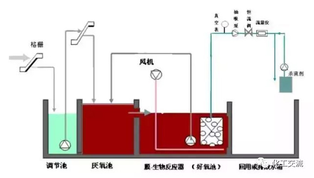 AO-MBR工艺在AO-MBR系统中,被隔除了悬浮物和杂物的废水流入调节池,均衡水质水量,然后进入沉淀池进行固液分离。上清液流入MBR处理池,MBR处理池设计为AO系统:在前段,进段的回流水充分混合进行生物反硝化脱氮,在后段进行生物降解和硝化,同时加碱,处理后的废水直接排放。