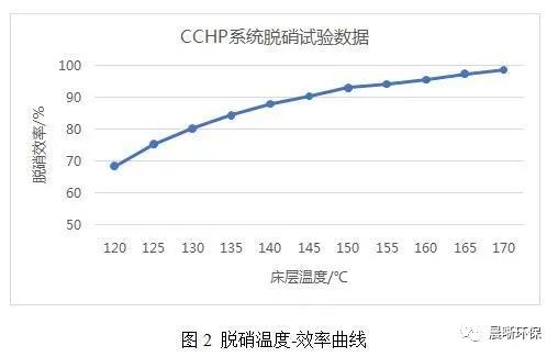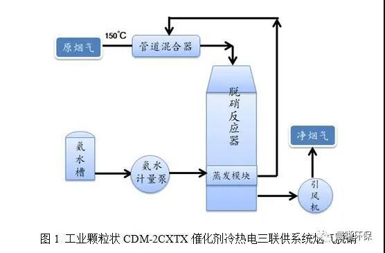 工业化测试选用冷热电三联供系统(CCHP)烟气,进口烟气中SO2浓度<10mg/Nm³、NOX浓度约900mg/Nm³、水蒸气含量约15.0%(vol)、进口烟气温度在130~180℃、空速为4400h-1。